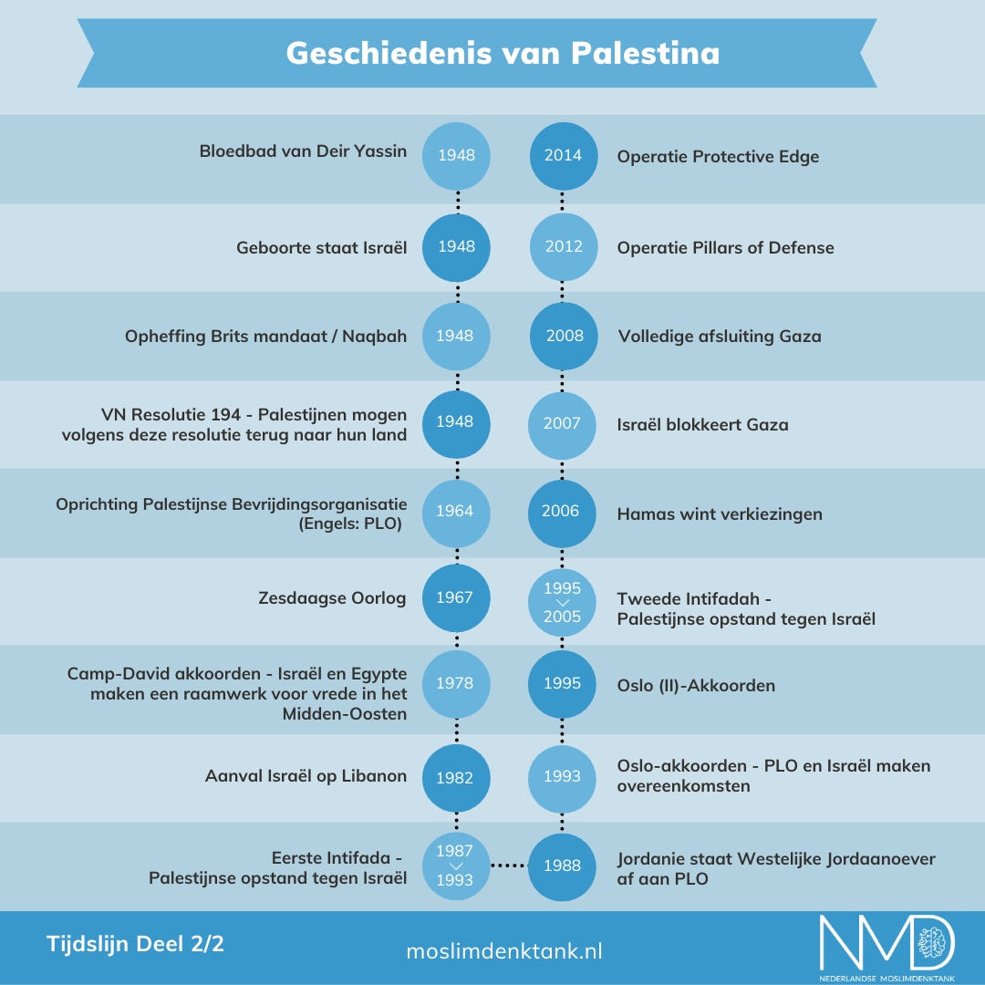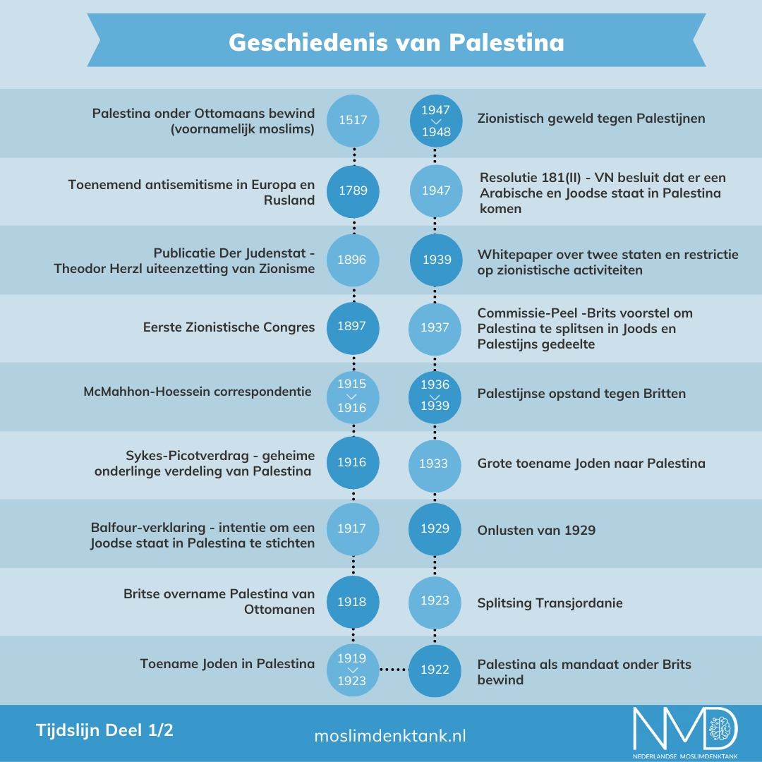 Vanuit NMD delen we betrouwbare informatie over de geschiedenis van Palestina. Op deze tijdlijn geven we belangrijke gebeurtenissen weer die hebben geleid tot de huidige situatie in Palestina. De komende tijd zullen we een aantal gebeurtenissen uitdiepen. De posts kunnen jullie lezen op deze pagina. Deze informatie kunnen we gebruiken om verder in gesprek te gaan. Houd onze pagina in de gaten voor updates. Sharing is caring, dus share, tag en like vooral!